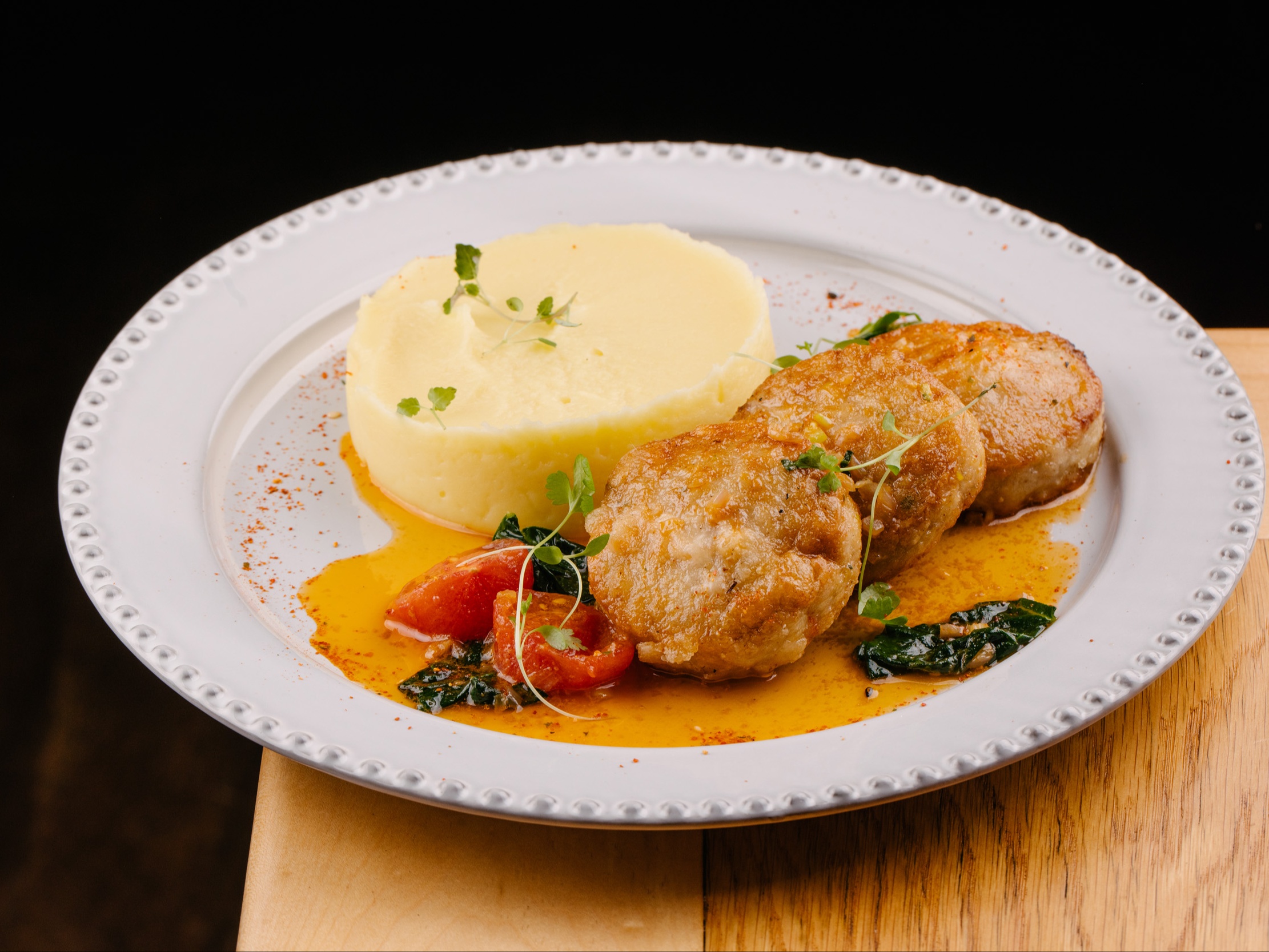 Котлеты (судак, сливки, яйцо) обжариваются на сливочном масле с бланшированными черри и базиликом подаются с воздушным пюре и долькой лимона. Это блюдо точно подарит Вам палитру приятных вкусовых ощущений.