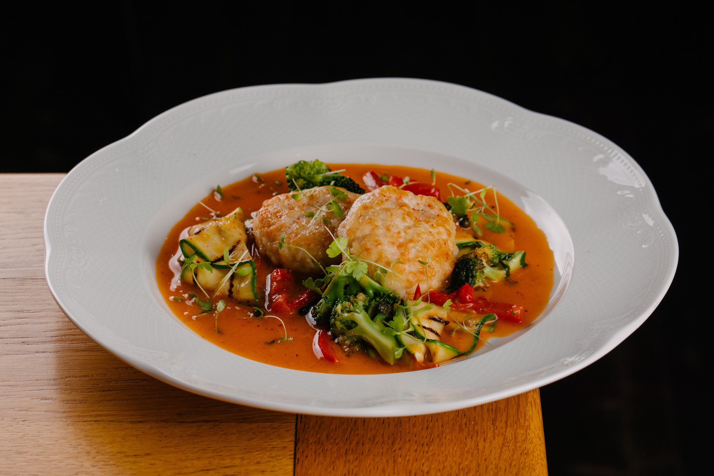 Нежные котлеты из креветок в соусе Средиземноморский песто подаются с брокколи, печеным болгарским перцем и кабачками.