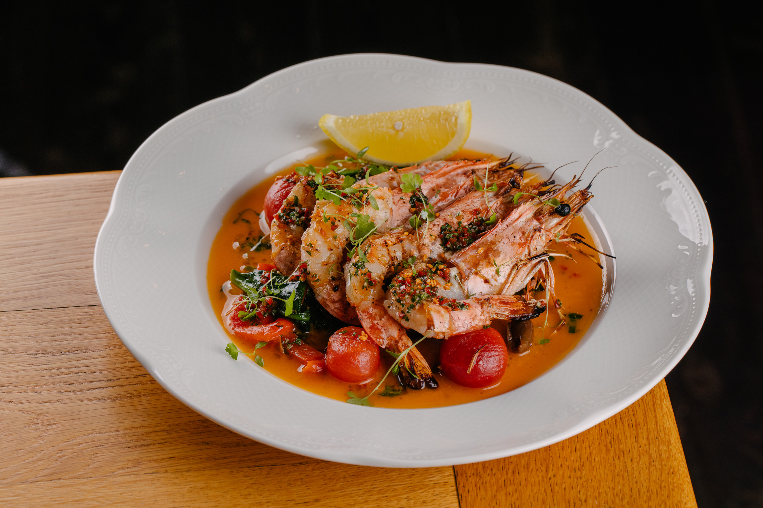Креветки в соусе Чимичури(кинза, петрушка, оливковое масло,лимонный сок, чеснок), в дополнении шпината, болгарского перца и бланшированных черри, оливок и каперсов. Подаются с долькой лимона.